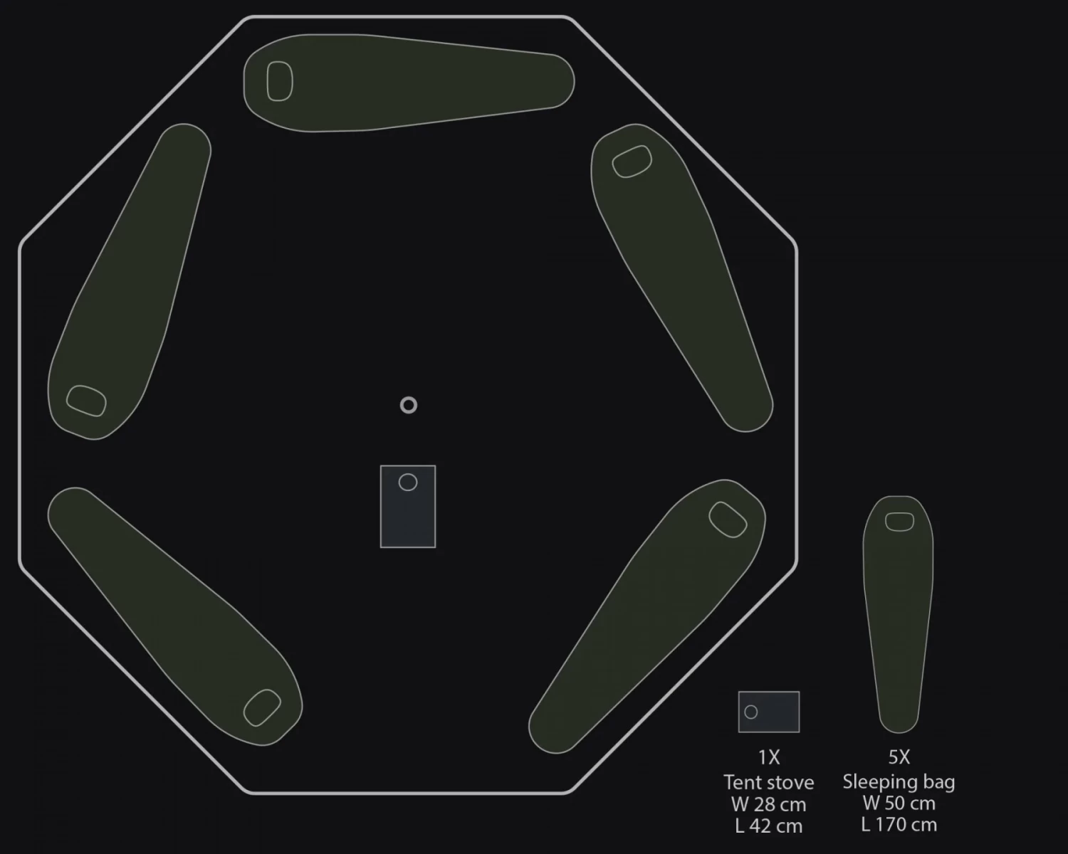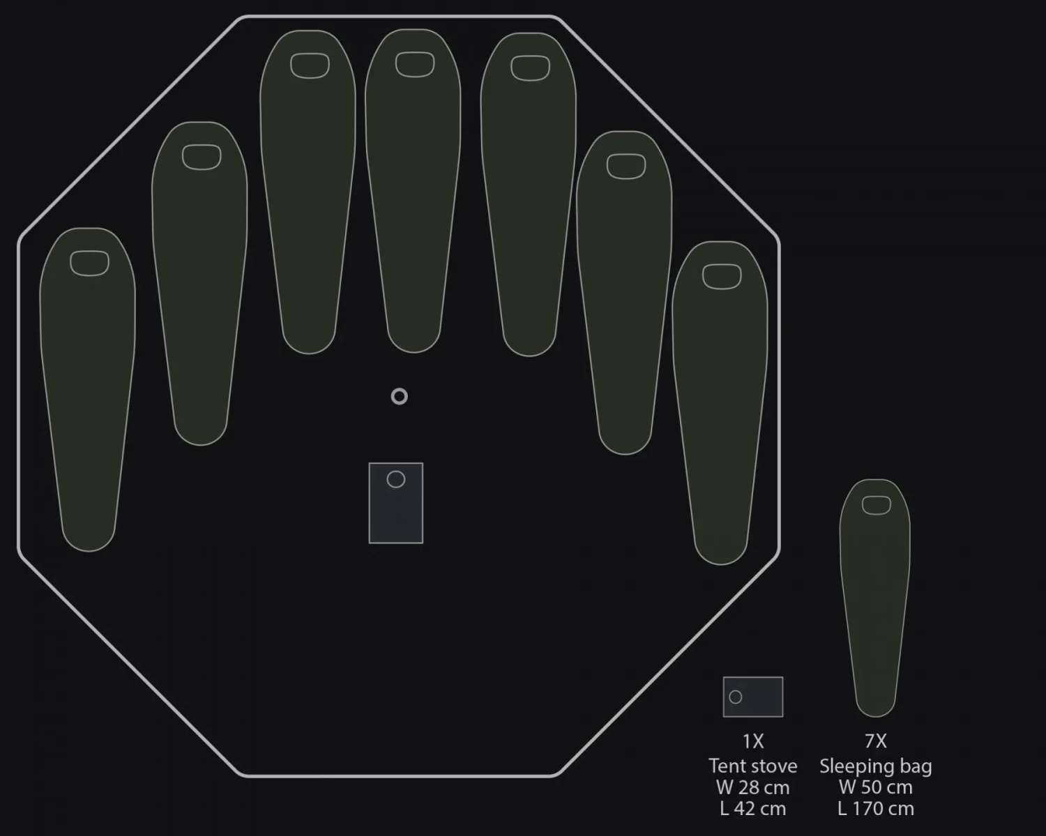 Il s’agit d’un système complet, prêt à l’emploi comprenant : la toile de tente, un mât central, 8 poteaux d’angle et 8 piquets. Le tapis de sol et le poêle à bois montré sur les photos sont vendus séparément.