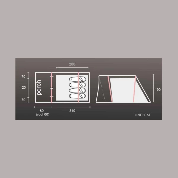 Pour plus de confort, le tapis de sol de cette tente est cousu au double toit, permettant ainsi une meilleure protection contre les insectes et les intempéries.